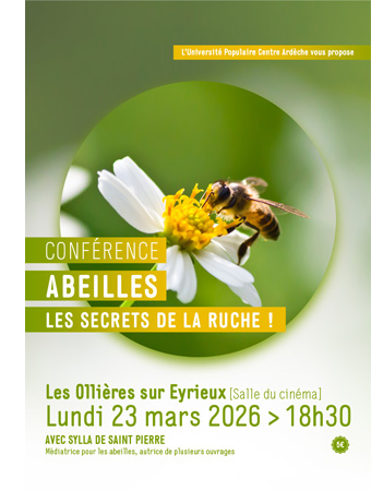 L'Université Populaire Centre Ardèche vous propose, lundi 23 mars 2026 à 18h30 aux Ollières sur Eyrieux (salle du cinéma) la conférence de Sylla de Saint Pierre : « Abeilles, les secrets de la ruche ! ».