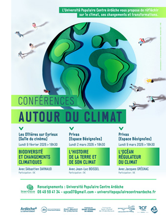 - Conférence « L'océan, régulateur du climat, foyer de biodiversité » avec Jacques Grégnac, lundi 9 mars 2026 à 18h30, à l'amphithéâtre du Pôle Bésignoles à Privas - Participation : 5€