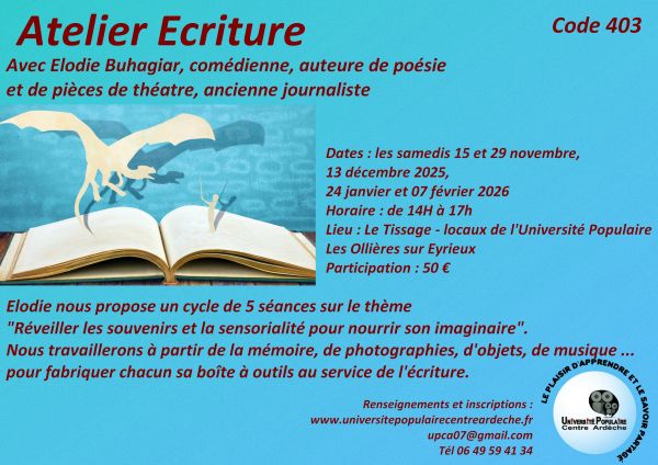 Avec Élodie, auteure de poésie, de pièces de théâtre, vous travaillerez à partir de la mémoire, de photographies, d'objets, de musique...pour fabriquer votre boîte à outils au service de l'écriture.